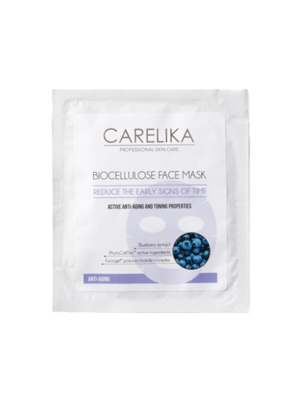 Биоцеллюлозная антивозрастная маска для лица с черникой CARELIKA Biocellulose Anti-Ageing Face and Neck Mask with Blueberry Extract